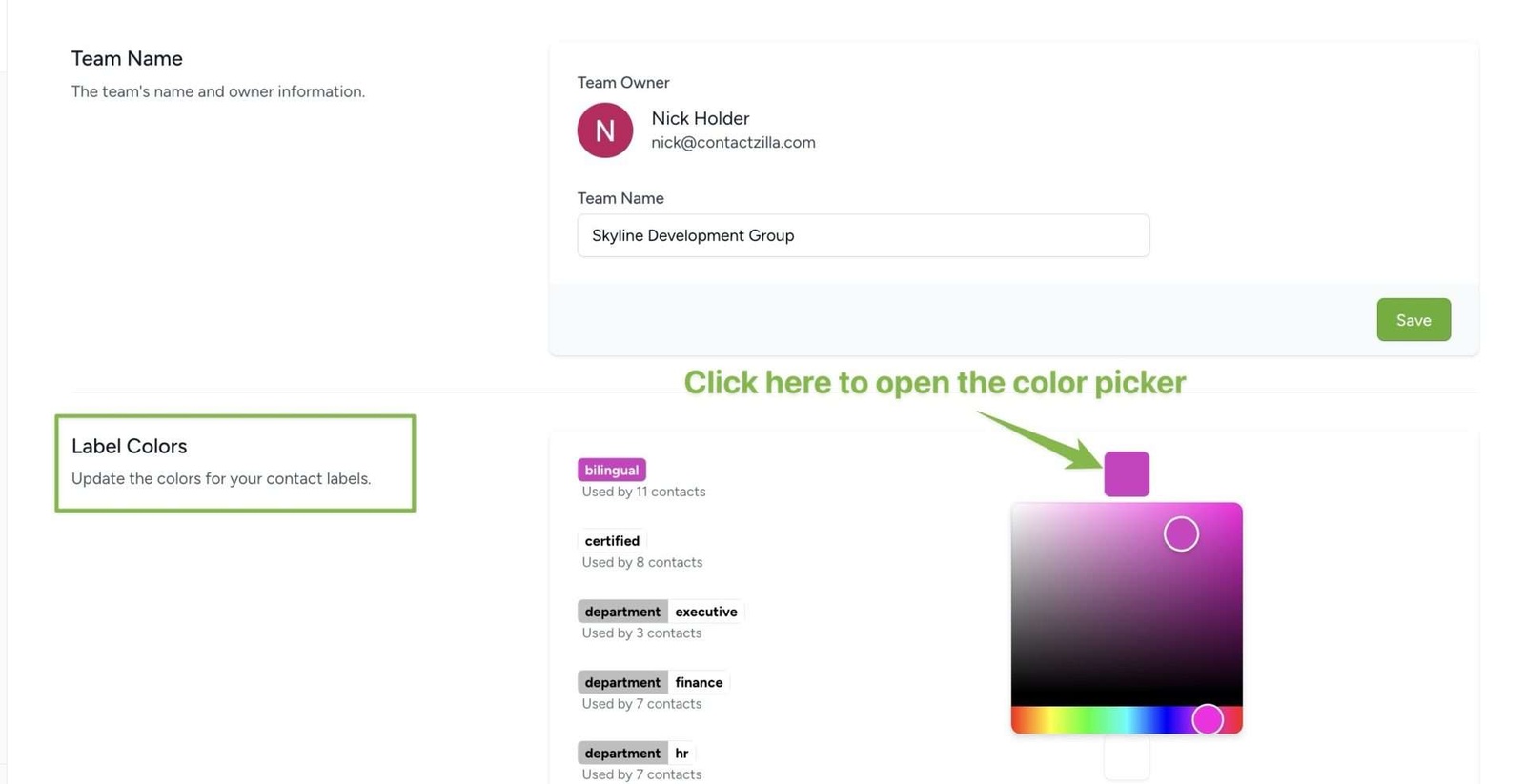 3) When you have selected a color, scroll down and hit ‘Save’. The new label color will be applied immediately across the team.