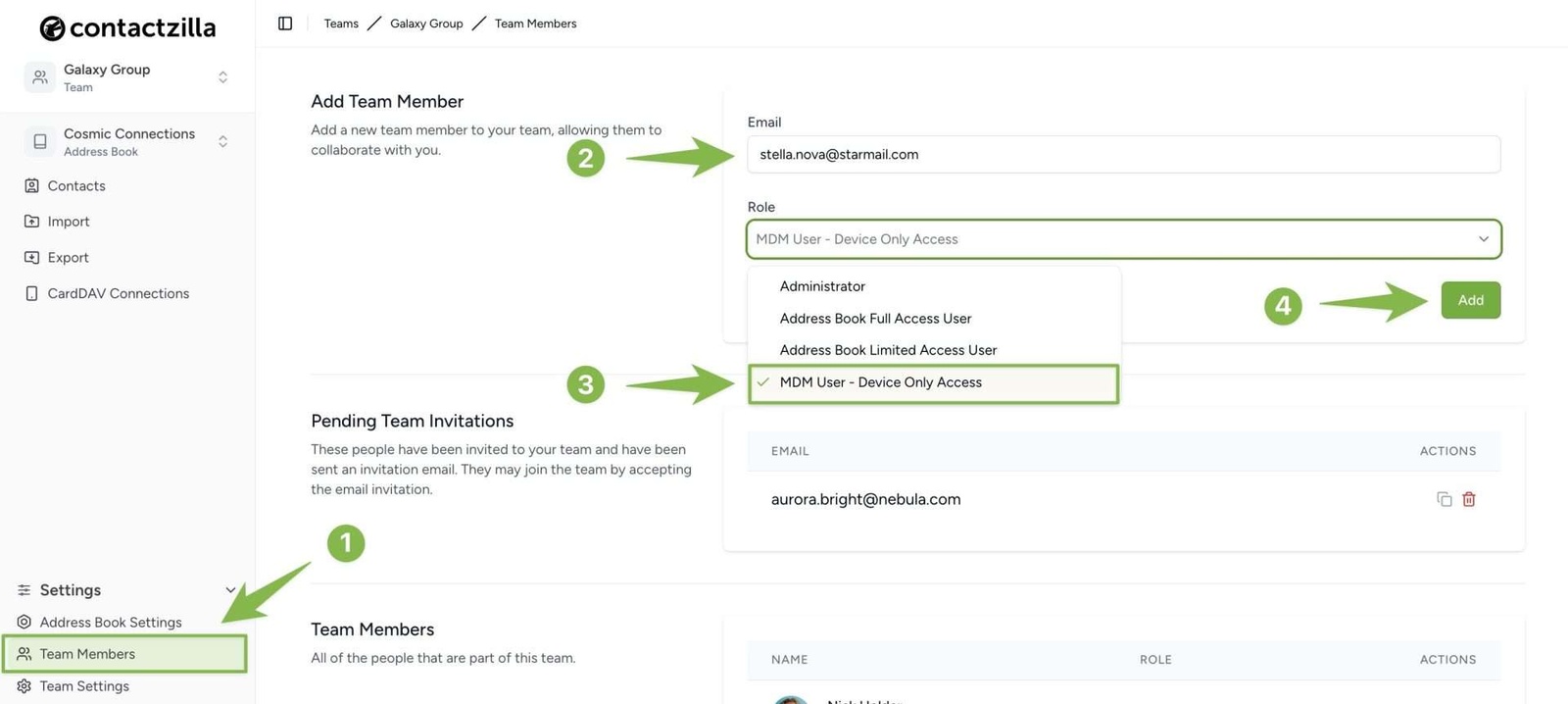 1) Navigate to the Team Members section in your Contactzilla account.